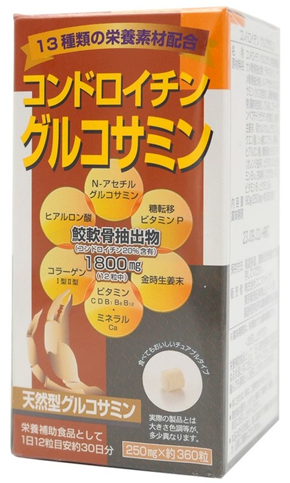 Кальций, Витамин В1, Витамин В6, Витамин В12, Витамин С, Витамин D, Экстракт акульего хряща (хондроитин), N-ацетилглюкозамин, Гиалуроновая кислота, Имбирь кинтоки (450 мг), Пептид рыбного коллагена, Коллаген Ⅱтипа (экстракт куриного хряща), Витамин Р (альфа глюкозил гесперидин)