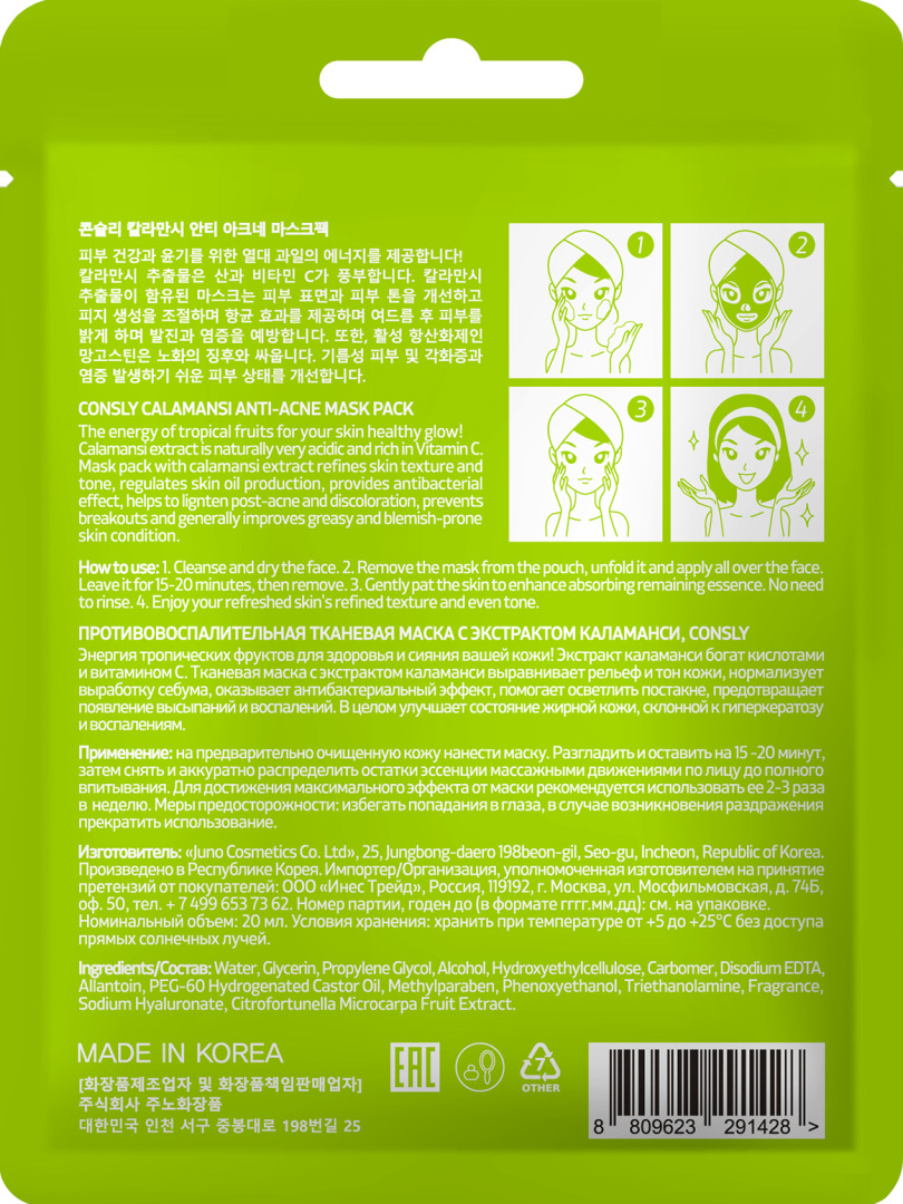 CNS F Маска тканевая противовоспалительная с экстрактом каламанси Calamansi Anti-Acne Mask Pack, 20мл