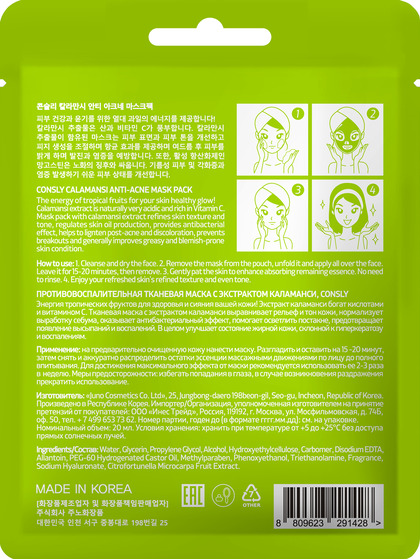 Тканевая маска с экстрактом каламанси выравнивает рельеф и тон кожи, нормализует выработку себума, оказывает антибактериальный эффект, помогает осветлить пост-акне, предотвращает появление высыпаний и воспалений. В целом улучшает состояние жирной кожи, склонной к гиперкератозу и воспалениям.