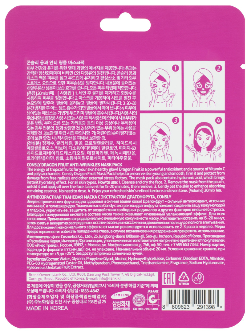 Тканевая маска Consly с экстрактом драгонфрута поможет сохранить вашу кожу молодой и гладкой, укрепить ее, защитить от воздействия свободных радикалов и других факторов внешнего стресса. Благодаря гиалуроновой кислоте в составе маска также оказывает мгновенный увлажняющий эффект. Для всех типов кожи. Применение: На предварительно очищенную кожу нанести маску. Разгладить и оставить на 15- 20 минут, затем снять и аккуратно распределить остатки эссенции массажными движениями по лицу до полного впитывания. Для достижения максимального эффекта от маски рекомендуется использовать ее 2-3 раза в неделю. Меры предосторожности: избегать попадания в глаза, в случае возникновения раздражения прекратить использование.
