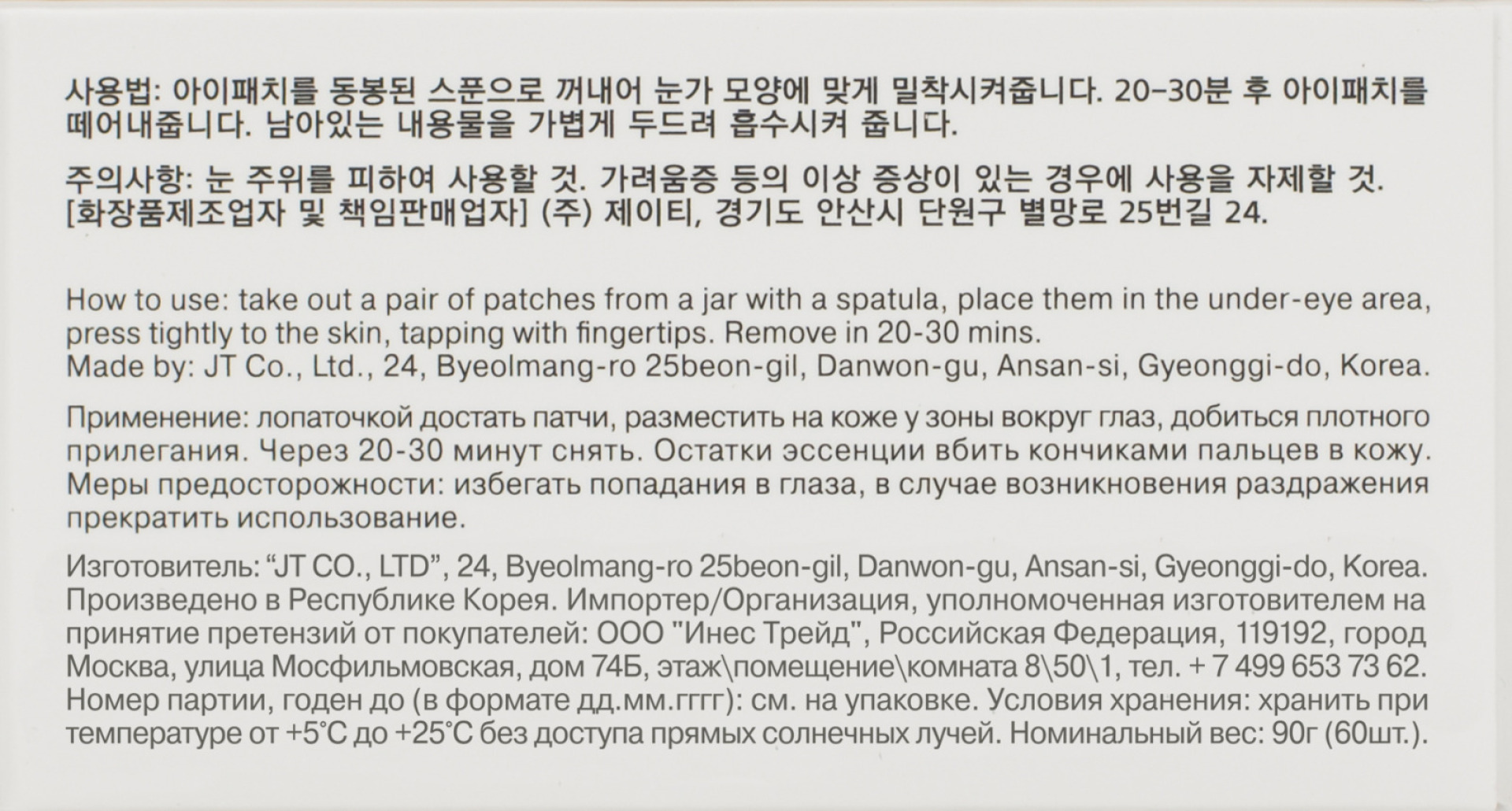 Нанести патчи на кожу под глазами и оставить на 15–20 минут. Затем снять и вбить кончиками пальцев в кожу остатки геля. Патчи также можно использовать для ухода за кожей носогубной или межбровной области.