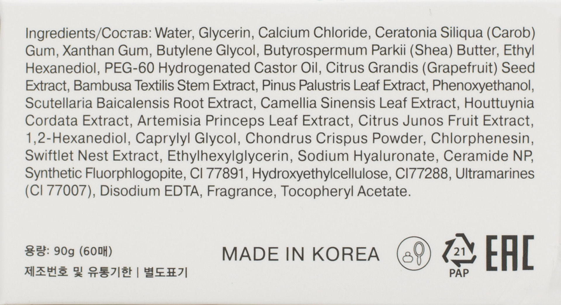 Water, Glycerin, Calcium Chloride, Ceratonia Siliqua (Carob) Gum, Xanthan Gum, Butylene Glycol, Butyrospermum Parkii (Shea) Butter, Ethyl Hexanediol, PEG-60 Hydrogenated Castor Oil, Citrus Grandis (Grapefruit) Seed Extract, Bambusa Textilis Stem Extract, Pinus Palustris Leaf Extract, Phenoxyethanol, Scutellaria Baicalensis Root Extract, Camellia Sinensis Leaf Extract, Houttuynia Cordata Extract, Artemisia Princeps Leaf Extract, Citrus Junos Fruit Extract, 1,2-Hexanediol, Caprylyl Glycol, Chondrus Crispus Powder, Chlorphenesin, Swiftlet Nest Extract, Ethylhexylglycerin, Sodium Hyaluronate, Ceramide NP, Synthetic Fluorphlogopite, CI 77891, Hydroxyethylcellulose, CI77288, Ultramarines (CI 77007), Disodium EDTA, Fragrance, Tocopheryl Acetate.