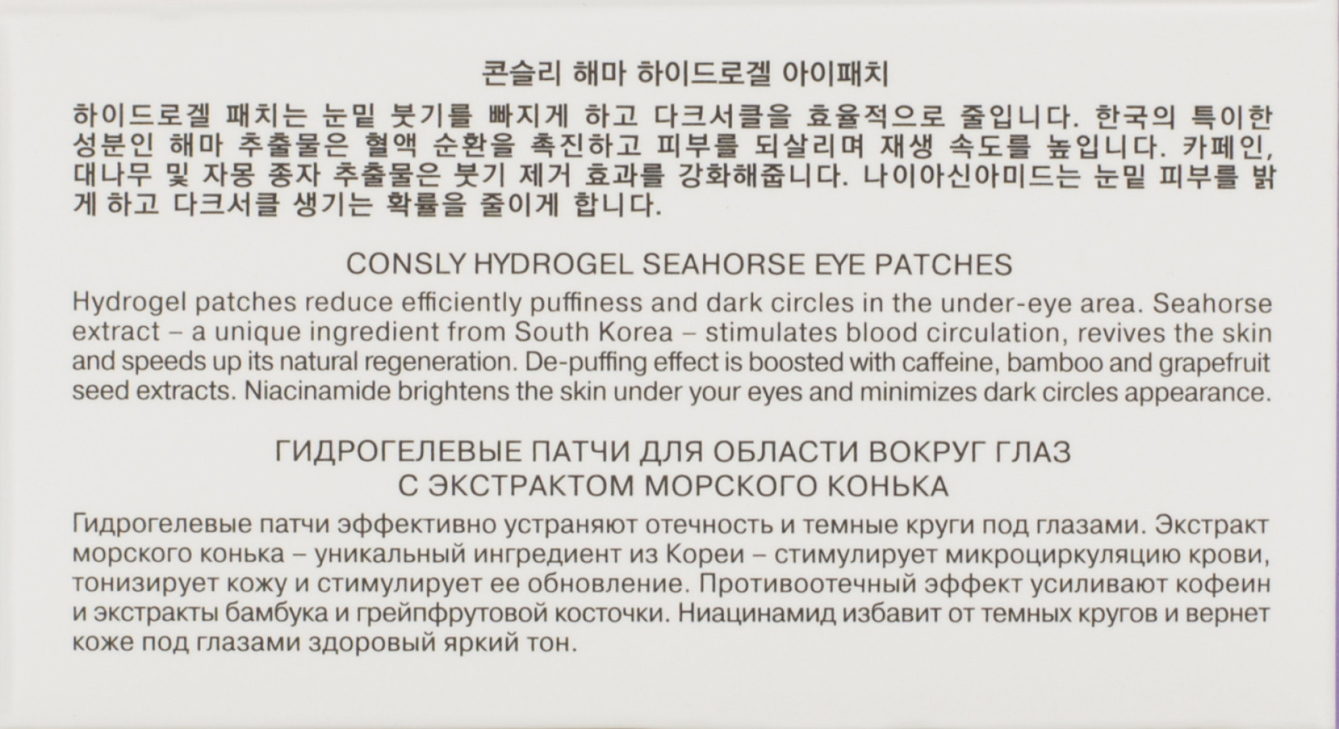 Гидрогелевые патчи с экстрактом морского конька эффективно устраняют отечность и темные круги под глазами, улучшают микроциркуляцию крови и ускоряют процесс регенерации эпидермиса. Патчи пропитаны высокоэффективной эссенцией на основе комплекса растительных экстрактов, ниацинамида и кофеина, которая способствует выравниванию тона кожи в зоне вокруг глаз и великолепно её тонизирует. Вы можете использовать патчи в зоне носогубных складок и в зоне межбровья при необходимости.