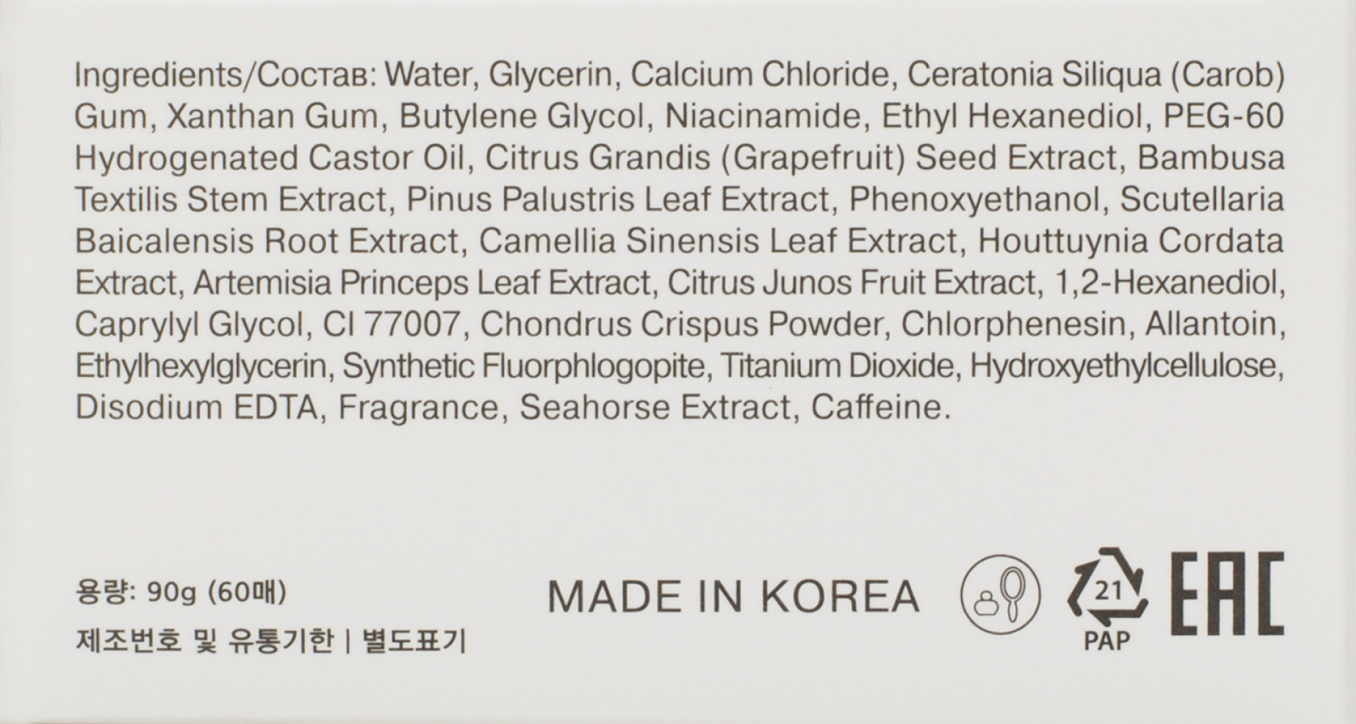 Water, Glycerin, Calcium Chloride, Ceratonia Siliqua (Carob) Gum , Xanthan Gum, Butylene Glycol, Niacinamide, Ethyl Hexanediol, PEG-60 Hydrogenated Castor Oil, Citrus Grandis (Grapefruit) Seed Extract, Bambusa Textilis Stem Extract, Pinus Palustris Leaf Extract, Phenoxyethanol, Scutellaria Baicalensis Root Extract , Camellia Sinensis Leaf Extract, Houttuynia Cordata Extract, Artemisia Princeps Leaf Extract, Citrus Junos Fruit Extract, 1,2-Hexanediol , Caprylyl Glycol, CI 77007, Chondrus Crispus Powder , Chlorphenesin, Allantoin, Ethylhexylglycerin, Synthetic Fluorphlogopite, Titanium Dioxide, Hydroxyethylcellulose , Disodium EDTA, Fragrance, Seahorse Extract, Caffeine.