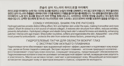 Гидрогелевые патчи с экстрактом акульего плавника обеспечивают ярко выраженный лифтинг-эффект, укрепляют и подтягивают кожу вокруг глаз, делая ее более гладкой и сияющей. Патчи пропитаны специальной эссенцией, которая содержит комплекс активных растительных компонентов, коллаген и эластин. Особый компонент - экстракт плавника акулы содержит микропротеин IDC, который обладает способностью восстанавливать ткани организма и оказывает сильный омолаживающий эффект на кожу.