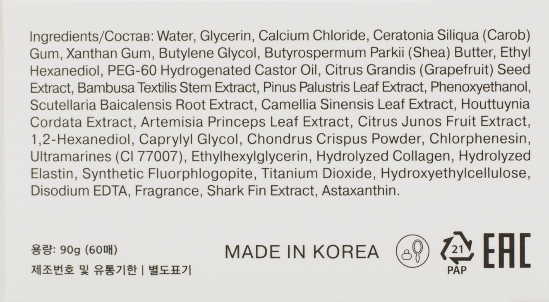 Water, Glycerin, Calcium Chloride, Ceratonia Siliqua (Carob) Gum, Xanthan Gum, Butylene Glycol, Butyrospermum Parkii (Shea) Butter, Ethyl Hexanediol, PEG-60 Hydrogenated Castor Oil, Citrus Grandis (Grapefruit) Seed Extract, Bambusa Textilis stem Extract, Pinus Palustris leaf Extract, Phenoxyethanol, Scutellaria Baicalensis Root Extract, Camellia Sinensis Leaf Extract, Houttuynia Cordata Extract, Artemisia Princeps Leaf Extract, Citrus Junos Fruit Extract, 1,2-Hexanediol, Caprylyl Glycol, Chondrus Crispus Powder, Chlorphenesin, Ultramarines (CI 77007), Ethylhexylglycerin, Hydrolyzed Collagen, Hydrolyzed Elastin, Synthetic Fluorphlogopite, Titanium Dioxide, Hydroxyethylcellulose, Disodium EDTA, Fragrance, Shark Fin Extract, Astaxanthin.