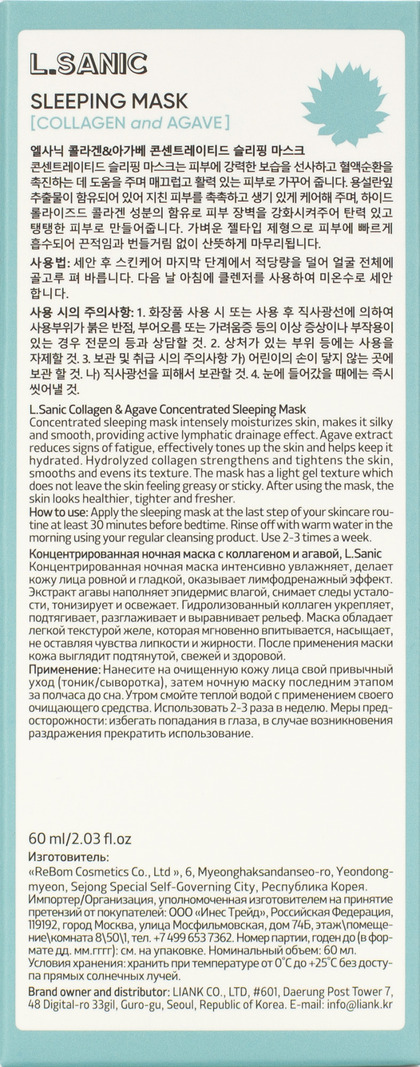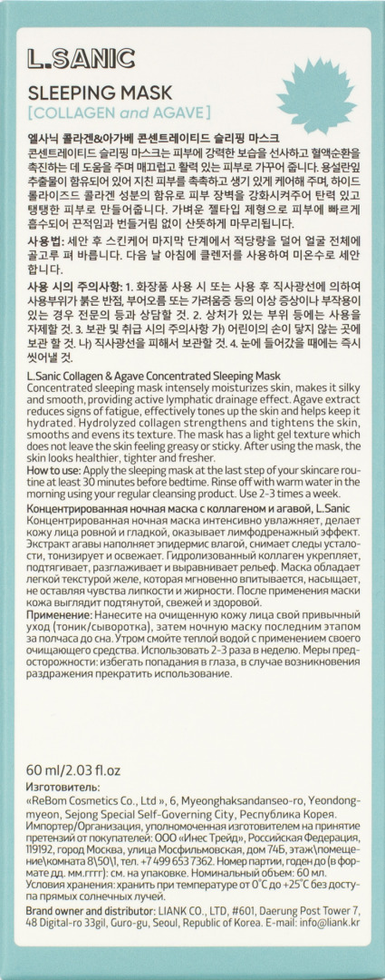 LSN Mask Маска концентрированная ночная с коллагеном и агавой Collagen & Agave Concentrated Sleeping Mask, 60мл