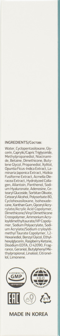Water, Cyclopentasiloxane, Glycerin, Caprylic / Capric Triglyceride, Methylpropanediol, Niacinamide, Betaine, Dimethicone, Butylene Glycol, Propanediol, Xylitol, Opuntia Ficus-Indica Extract, Laminaria Japonica Extract, Hizikia Fusiforme Extract, Acmella Oleracea Extract, Hydrolyzed Collagen, Allantoin, Panthenol, Sodium Hyaluronate, Adenosine, Cetearyl Glucoside, Sorbitan Olivate, Cetearyl Alcohol, Polysorbate 80, Cyclohexasiloxane, Isohexadecane, Xanthan Gum, Glyceryl Acryrylate / Acrylic Acid Copolymer, Dimethicone / Vinyl Dimethicone Crosspolymer, Ammonium Acryloyldimethyltaurate / VP Copolymer, Sodium Polyacrylate, Sodium Acrylate / Sodium cryloyldimethyl Taurate Copolymer, 1,2-Hexanediol, Benzyl Glycol, Ethylhexylglycerin, Raspberry Ketone, Disodium EDTA, CI 42090, Fragrance, Geraniol, Butylphenyl Methylpropional, Linalool, Citronellol, Limonene.