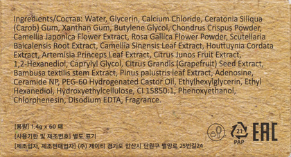 Water, Glycerin, Calcium Chloride, Ceratonia Siliqua (Carob) Gum, Xanthan Gum, Butylene Glycol, Chondrus Crispus Powder, Camellia Japonica Flower Extract, Rosa Gallica Flower Powder, Scutellaria Baicalensis Root Extract, Camellia Sinensis Leaf Extract, Houttuynia Cordata Extract, Artemisia Princeps Leaf Extract, Citrus Junos Fruit Extract, 1,2-Hexanediol, Caprylyl Glycol, Citrus Grandis (Grapefruit) Seed Extract, Bambusa textilis stem Extract, Pinus palustris leaf Extract, Adenosine, Ceramide NP, PEG-60 Hydrogenated Castor Oil, Ethylhexylglycerin, Ethyl Hexanediol, Hydroxyethylcellulose, CI 15850:1, Phenoxyethanol, Chlorphenesin, Disodium EDTA, Fragrance.