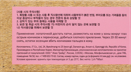 Применение: лопаточкой достать патчи, разместить на коже у зоны вокруг глаз острым кончиком к переносице, добиться плотного прилегания. Через 20-30 минут снять, остатки эссенции вбить кончиками пальцев в кожу.