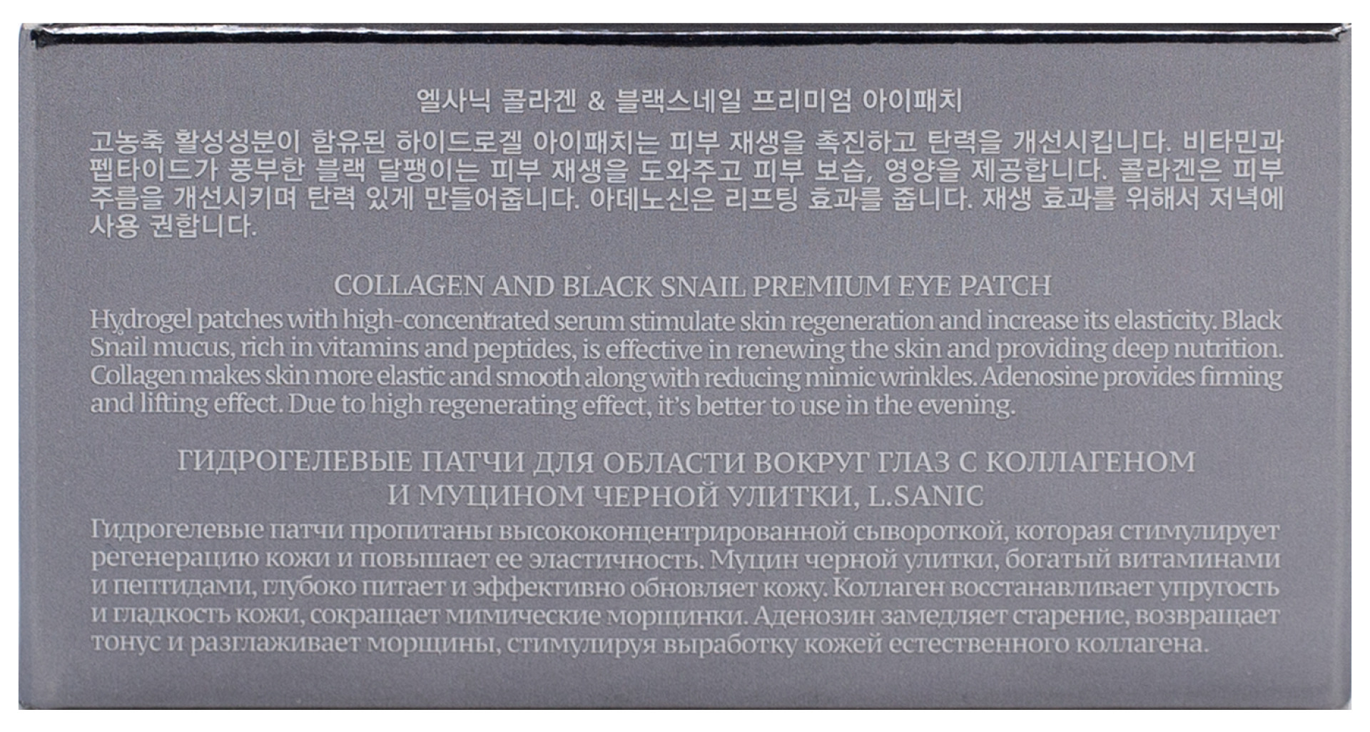 Гидрогелевые патчи пропитаны высококонцентрированной сывороткой, которая стимулирует регенерацию кожи и повышает ее эластичность. Муцин черной улитки глубоко питает кожу и эффективно обновляет ее. Коллаген восстанавливает упругость и гладкость кожи, сокращает мимические морщинки. Аденозин замедляет старение, возвращает тонус и разглаживает морщины, стимулируя выработку кожей естественного коллагена.