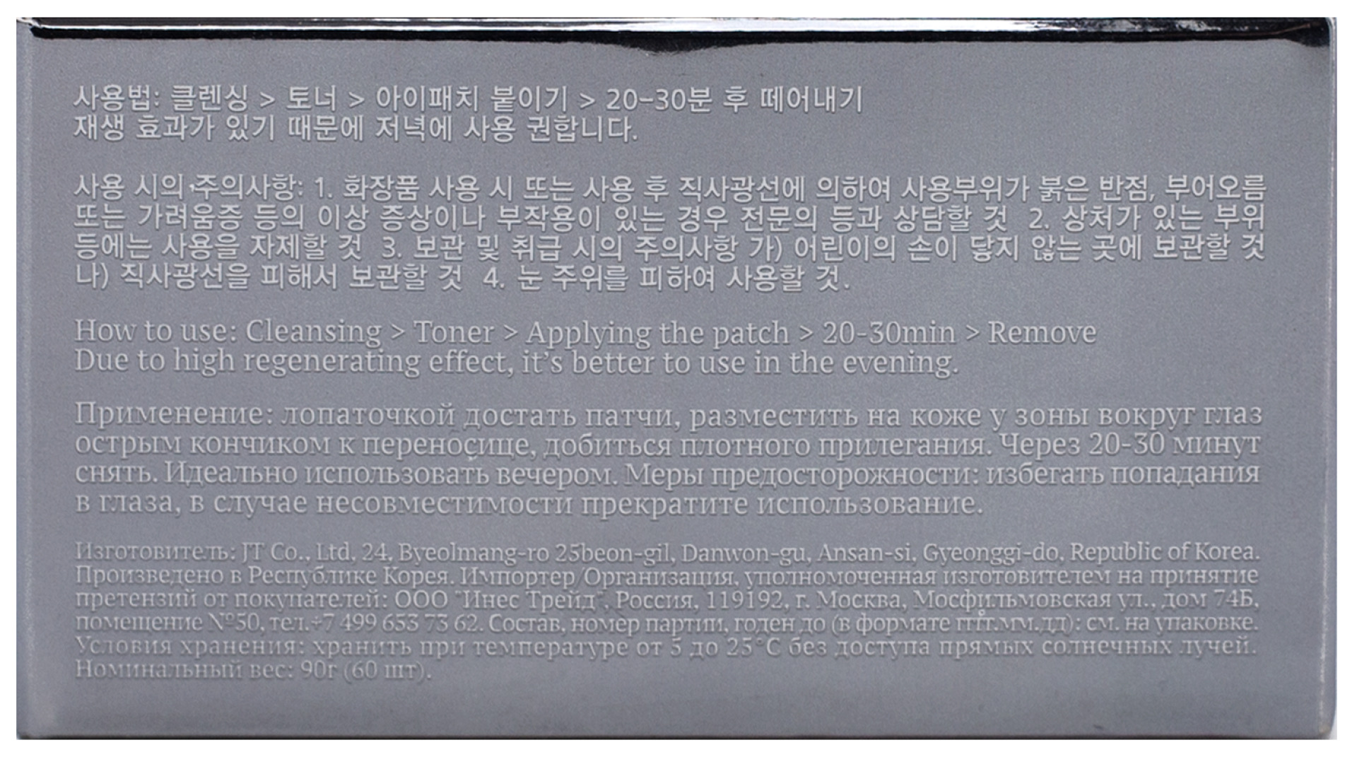 Применение: Лопаточкой достать патчи, разместить на коже у зоны вокруг глаз острым кончиком к переносице, добиться плотного прилегания. Через 20-30 минут снять.