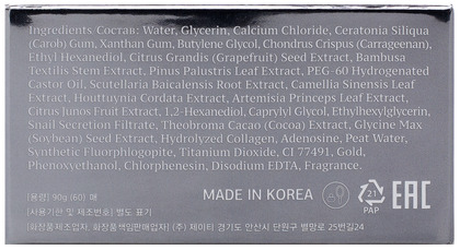 Water, Glycerin, Calcium Chloride, Ceratonia Siliqua (Carob) Gum, Xanthan Gum, Butylene Glycol, Chondrus Crispus (Carrageenan Ethyl Hexanediol, Citrus Grandis (Grapefruit) Seed Extract, Bambusa Textilis Stem Extract, Pinus Palustris Leaf Extract, PEG-60 Hydrogenated Castor Oil, Scutellaria Baicalensis Root Extract, Camellia Extract, Houttuynia Cordata Extract, Artemisia Princeps Leaf Extract, Citrus Junos Fruit Extract, 1,2-Heanediol, Caprylyl Glycol, Ethylhexylglycerin, Snail Secretion Filtrate, Theobroma Cacao (Cocoa) Extract, Glycine Max (Soybean) Seed Extract, Hydrolyzed Collagen, Adenosine, Peat Water, Synthetic Fluorphlogopite, Titanium Dioxide, CI 77491. Gold, Phenoxyethanol, Chlorphenesin, Disodium EDTA, Fragrance.