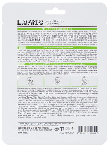 LSN Маска тканевая для очищения пор с AHA/BHA кислотами AHA/BHA Clearing Mask Sheet, 25мл