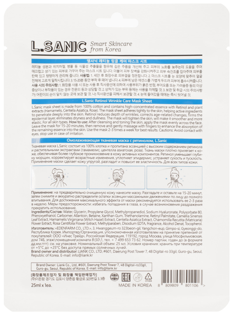 Омолаживающая тканевая маска L.Sanic состоит из 100% хлопка и пропитана эссенцией с высоким содержанием ретинола и растительными экстрактами (гамамелис, центелла азиатская, роза). Ткань маски плотно прилегает к коже, обеспечивая более глубокое проникновение в кожу активных компонентов.