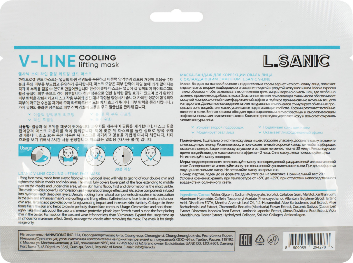 Охлаждающая бандажная маска прекрасно работает с овалом лица, способна откорректировать второй подбородок, подтянуть кожу и придать лицу более молодой вид. Лекало маски сделано таким образом, что полностью захватывает нижнюю треть лица, а также верхнюю часть шеи, где кожа быстрее всего теряет упругость. Кофеин в составе проникает в глубокие слои дермы, обладает активным дренажным эффектом, стимулирует ускоренную регенерацию клеток. Витамин Е блокирует действие свободных радикалов, тем самым замедляя старение кожи. Винная кислота в составе стимулирует выработку коллагена и эластина, отшелушивает ороговевшие частички, омолаживает кожу. Несколько видов коллагена скульптурируют овал лица, оказывают видимый лифтинговый эффект. Способ применения: Тщательно очистите кожу лица и шеи. Вскройте упаковку, достаньте маску и снимите с нее защитную пленку. Растяните маску и приложите гелевой стороной к лицу, так чтобы подбородок оказался в центре. Закрепите маску за ушами и оставьте не менее, чем на 30 минут. Рекомендуемое время воздействия для максимального эффекта – 2 часа. Сняв маску, легко помассируйте щеки. Не используйте маску повторно.