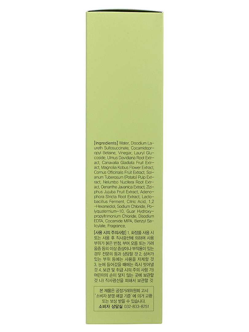 Water, Disodium Laureth Sulfosuccinate, Vinegar, Cocamidopropyl Betaine, Lauryl Glucoside, Sodium Chloride, Butylene Glycol, Lactobacillus Ferment, Fragrance (Benzyl Salicylate), Citric Acid, Polyquaternium-10, Guar Hydroxypropyltrimonium Chloride, Disodium EDTA, Cocamide MIPA, Ulmus Davidiana Root Extract, Solanum Tuberosum (Potato) Pulp Extract, Oenanthe Javanica Extract, Nelumbo Nucifera Root Extract, Magnolia Kobus Flower Extract, Cornus Officinalis Fruit Extract, Canavalia Gladiata Fruit Extract, Adenophora Stricta Root Extract, 1,2-Hexanediol, Sodium Acetate, Isopropyl Alcohol, Ethylhexylglycerin
