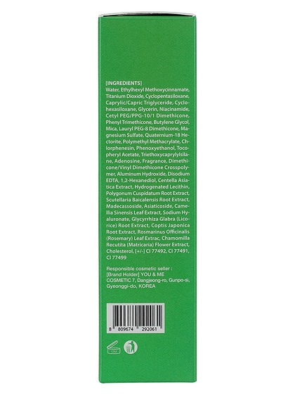 Water, Ethylhexyl Methoxycinnamate, Titanium Dioxide, Cyclopentasiloxane, Caprylic/Capric Triglyceride, Cyclohexasiloxane, Glycerin, Niacinamide, Cetyl PEG/PPG-10/1 Dimethicone, Phenyl Trimethicone, Butylene Glycol, Mica, Lauryl PEG-8 Dimethicone, Magnesium Sulfate, Quaternium-18 Hectorite, Polymethyl Methacrylate, Chlorphenesin, Phenoxyethanol, Tocopheryl Acetate, Triethoxycaprylylsilane, Adenosine, Fragrance, Dimethicone/Vinyl Dimethicone Crosspolymer, Aluminum Hydroxide, Disodium EDTA, 1,2-Hexanediol, Centella Asiatica Extract, Hydrogenated Lecithin, Polygonum Cuspidatum Root Extract, Scutellaria Baicalensis Root Extract, Madecassoside, Asiaticoside, Camellia Sinensis Leaf Extract, Sodium Hyaluronate, Glycyrrhiza Glabra (Licorice) Root Extract, Coptis Japonica Root Extract, Rosmarinus Officinalis (Rosemary) Leaf Extract, Chamomilla Recutita (Matricaria) Flower Extract, Cholesterol, CI 77492, CI 77491, CI 77499