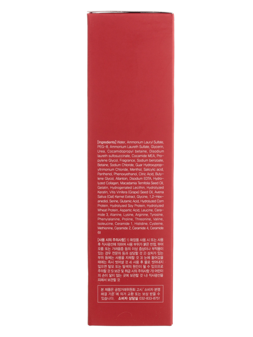 Water, Ammonium lauryl sulfate, Sodium benzoate, Phenoxyethanol, Cocamidopropyl betaine, Sodium chloride, Peg-8, Disodium laurenth sulfosuccinate, Glycerin, Urea, Cocamide MEA, Propylene glycol, Fragrance, Betaine, Guar hydroxypropyltrimonium chloride, Menthol, Salicylic acid, Panthenol, Hydrogenated lecithin, Grape seed oil, Ceramide 1, Ceramide 2, Ceramide 3, Ceramide 4, Ceramide 6II, 1,2-Hexanediol, Cirtic acid, Butylene glycol, Glycine, Serine, Glutamic acid, Aspartic acid, Leucine, Alanine, Lysine, Arginine, Tyrosine, Hydrolyzed collagen, Hydrolyzed keratin, Gelatin, Oat kernel extract, Hydrolyzed corn protein, Hydrolyzed wheat protein, Hydrolyzed soy protein, Allantoin, Sodium chloride, Macadamia ternifolia seed oil