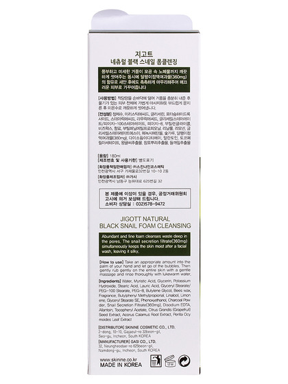 Purified water, Myristic Acid, Glycerin, Potassium Hydroxide, Stearic Acid, Lauric Acid, Glyceryl Stearate/PEG-100 Stearate, PEG-8, Fragrance, Butylene Glycol, Beeswax, Linalool, Limonene, Glyceryl Stearate SE, Phenoxyethanol, Charcoal Powder, Snail Secretion Filtrate, Dosidium EDTA, Allantoin, Tocopheryl Acetate, Grapefruit seed extract, Acorus Calamus Root extract, Perilla Ocymoides leaf extract