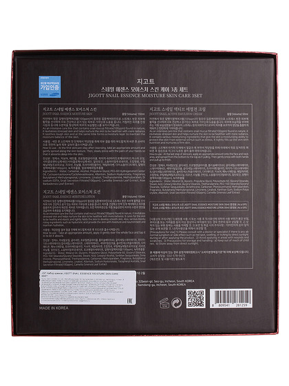 Изг-ль: Gasi Cosmetic Co.,Ltd., Республика Корея, 32, Neungheodae-ro, 625 beon-gil, Namdong-gu, Incheon. В набор входит крем, тонер и лосьон, а также две «дорожные » мини-версии лосьона и тонера. Увлажняющий антивозрастной крем содержит фильтрат секреции улиток, который обеспечивает увлажнение и питание, а также придает коже здоровый вид. Увлажняющий тонер помогает восстановить водный баланс кожи, улучшает ее эластичность, осветляет и борется с признаками старения. Лосьон богат питательными веществами и заботится о сухой и тусклой коже возвращая ей здоровый вид. Способ применения: нанести на очищенное лицо тонер, затем лосьон. Завершить уход кремом.