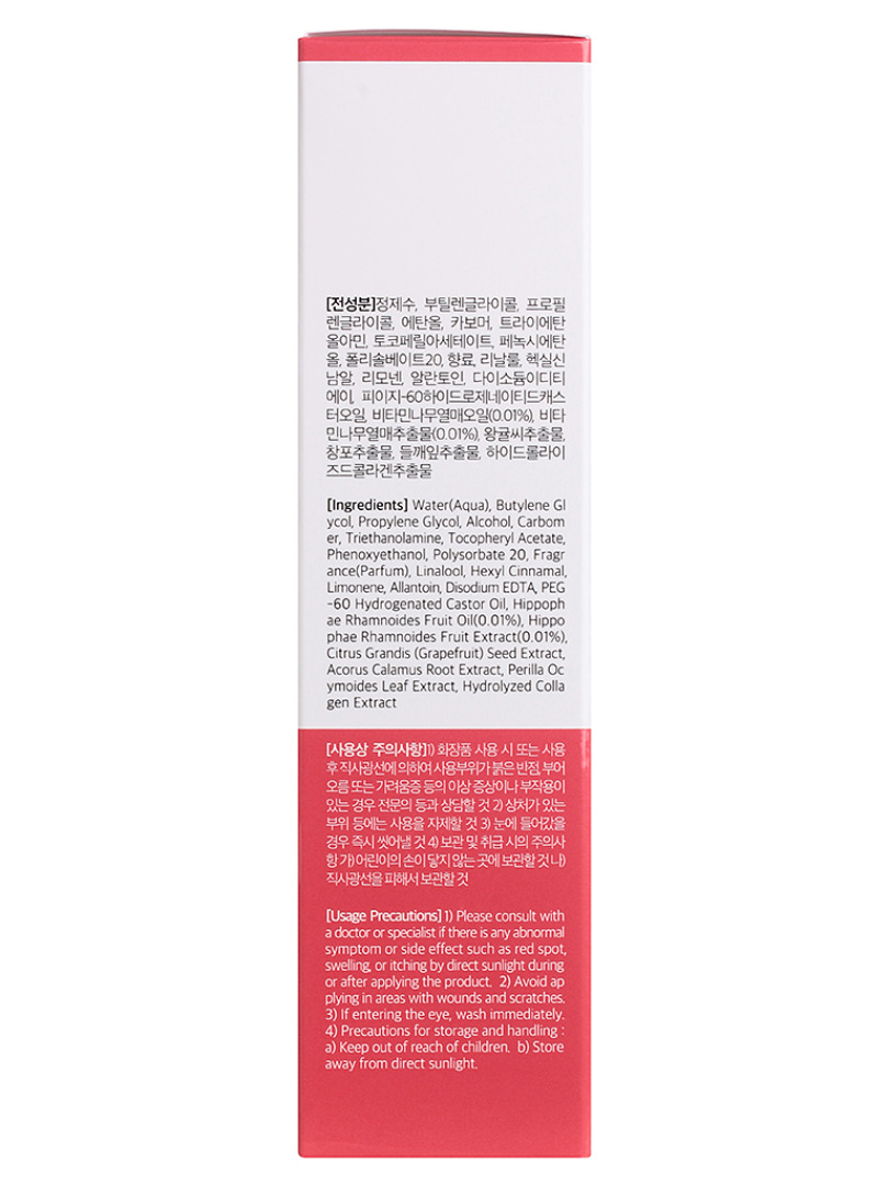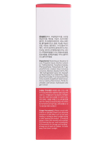 Purified water, butylene glycol, propylene glycol, alcohol, carbomer, triethanolamine, tocopheryl acetate, phenoxyethanol, polysorbate 20, fragrance, linalool, hexyl cinnamal, limonene, allantoin, disodium EDTA, PEG-60 Hydrogenated Castor Oil, Hippophae Rhamnoides Fruit Oil, Hippophae Rhamnoides Fruit Extract, Citrus Grandis (Grapefruit) Seed Extract, Acorus Calamus Root Extract, Perilla Ocymoides Leaf Extract, Hydrolyzed Collagen Extract