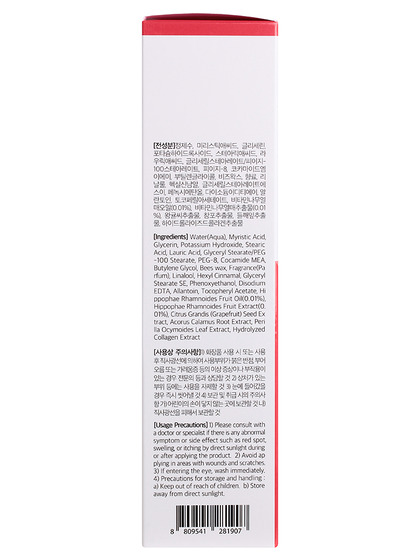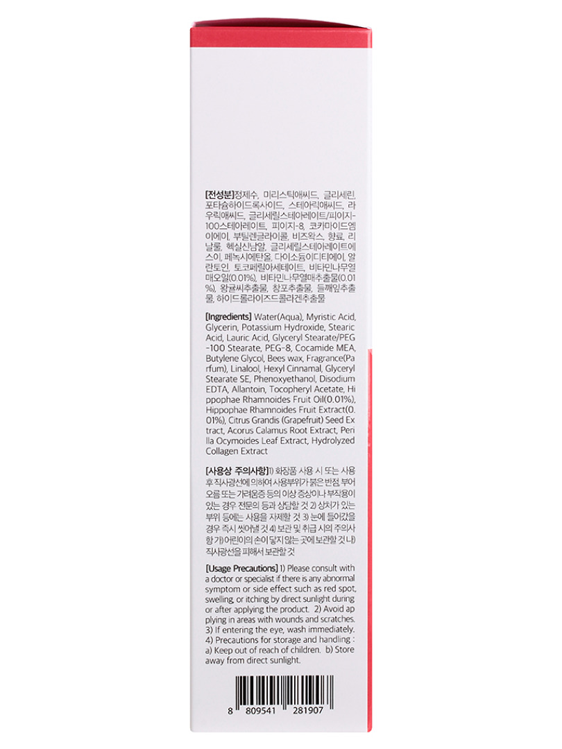 Purified water, myristic acid, glycerin, potassium hydroxide, stearic acid, lauric acid, glyceryl stearate/PEG-100 stearate, PEG-8, Cocamide MEA, Butylene Gylcol, Beeswax, Fragrance, Linalool, hexyl cinnamal, glyceryl stearate SE, Phenoxyethanol, Disodium EDTA, Allantoin, Tocopheryl Acetate, Hippophae Rhamnoides Fruit Oil, Hippophae Rhamnoides Fruit Extract, Citrus Grandis (Grapefruit) Seed Extract, Acorus Calamus Root Extract, Perilla Ocymoides Leaf Extract, Hydrolyzed Collagen Extract