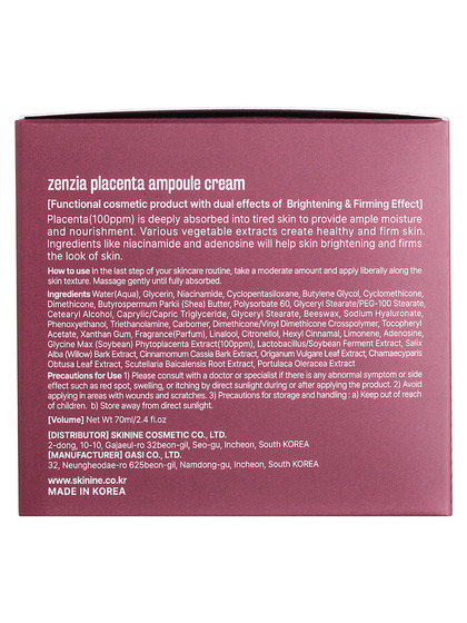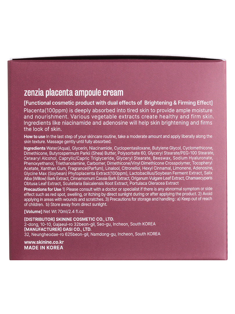 Изготовитель: Gasi Cosmetic Co.,Ltd., Республика Корея, 32, Neungheodae-ro, 625 beon-gil, Namdong-gu, Incheon. Функциональный крем на основе ферментированной плацентарной вытяжки. Плацентарный крем содержит вещества, близкие по составу к клеткам кожи и, легко проникая в нее, стимулирует регенерацию клеток, способствуя омолаживанию кожи. Крем ухаживает, питает восстанавливает кожу, повышает ее упругость и эластичность. Активные растительные компоненты в составе крема обладают увлажняющими, восстанавливающими и осветляющими свойствами. Способ применения: Небольшое количество крема нанести на очищенную кожу лица.