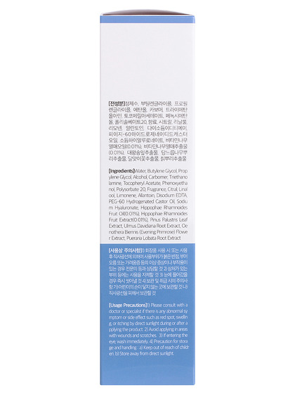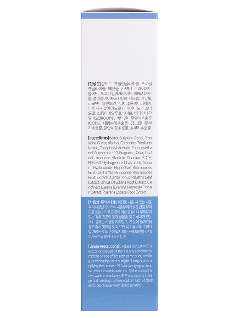 Purified water, butylene glycol, propylene glycol, alcohol, carbomer, triethanolamine, tocopheryl acetate, phenoxyethanol, polysorbate 20, fragrance, citral, linalool, limonene, allantoin, disodium EDTA, PEG-60 Hydrogenated Castor Oil, Sodium Hyaluronate, Hippophae Rhamnoides Fruit Oil, Hippophae Rhamnoides Fruit Extract, Pinus Palustris Lwaf Extract, Ulmus Davidiana Root Extract, Evening primrose flower extract, Pueraria Lobata Root Extract