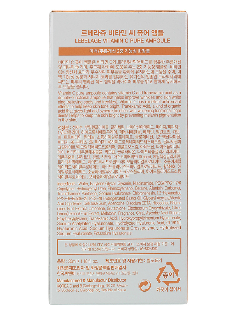 LBLG VIT C Сыворотка ампульная для сияния кожи лица с витамином С и транексамовой кислотой LEBELAGE VITAMIN C PURE AMPOULE 35ml