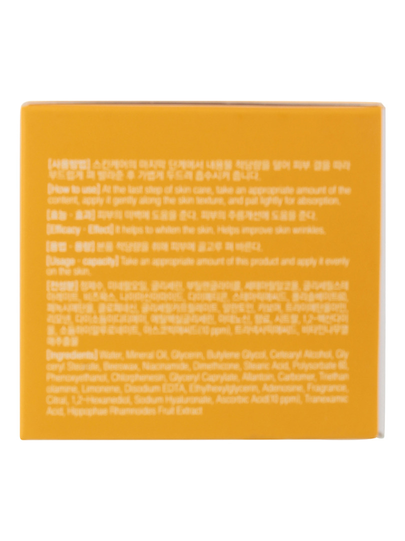 Изготовитель: KOREA C&B Co., Ltd., Корея, Республика, (Dodang-dong. 2F), 211, Oksan-ro, Bucheon-si, Gyeonggi-do. Крем для лица осветляющий с ниацинамидом, аллантоином и Витамином С, улучшает цвет лица, укрепляет клеточные мембраны, замедляет процессы старения, ускоряет регенерацию клеток и интенсивно увлажняет. Экстракт облепихи препятствует распаду коллагена в клетках, оказывает антимикробное и противовоспалительное действие, служит источником витаминов. Способ применения: нанести на чистую тонизированную кожу массажными движениями, дать впитаться.