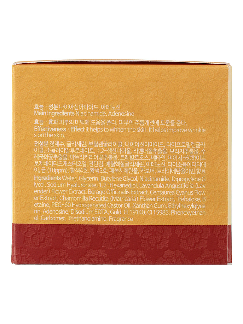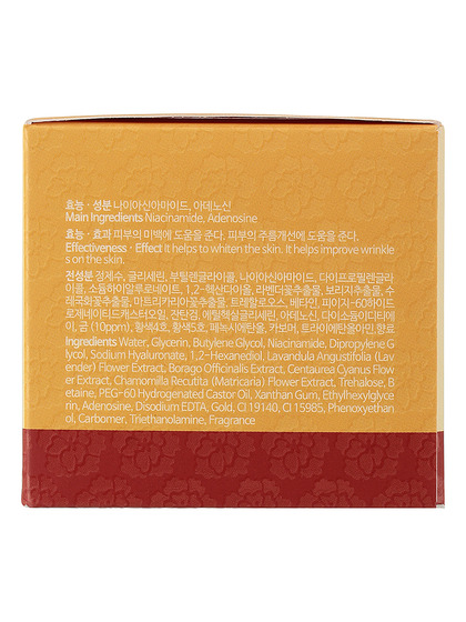 Изготовитель: SINDO P&G CO., Ltd., Корея, Республика, 401, Aenggogae-ro, Namdong-gu, Incheon Омолаживающий крем с эффектом anti-age разработан в соответствии с потребностями зрелой кожи. Средство активно ревитализирует кожу, приостанавливает процесс увядания, возвращает упругость и эластичность. Частички коллоидного золота улучшают проникающую способность эпидермиса, помогая другим компонентам проникать в кожу другим полезным ингредиентам и усиливая эффективность всего ухода. Способ применения: на предварительно очищенную, тонизированную кожу после использования сыворотки нанести необходимое количество крема и распределить по поверхности лица массирующими движениями.