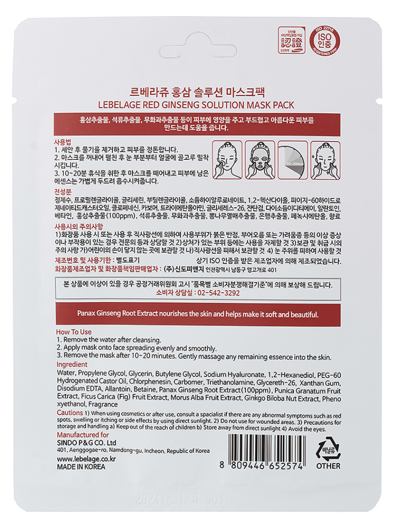 LBLG Маска тканевая LEBELAGE RED GINSENG SOLUTION MASK