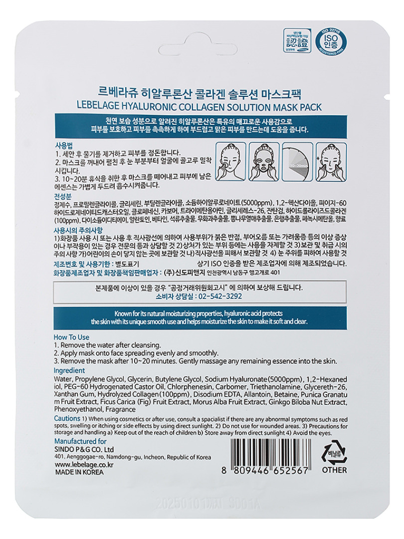 LBLG Маска для лица тканевая с коллагеном LEBELAGE HYALURONIC COLLAGEN SOLUTION MASK (23g)