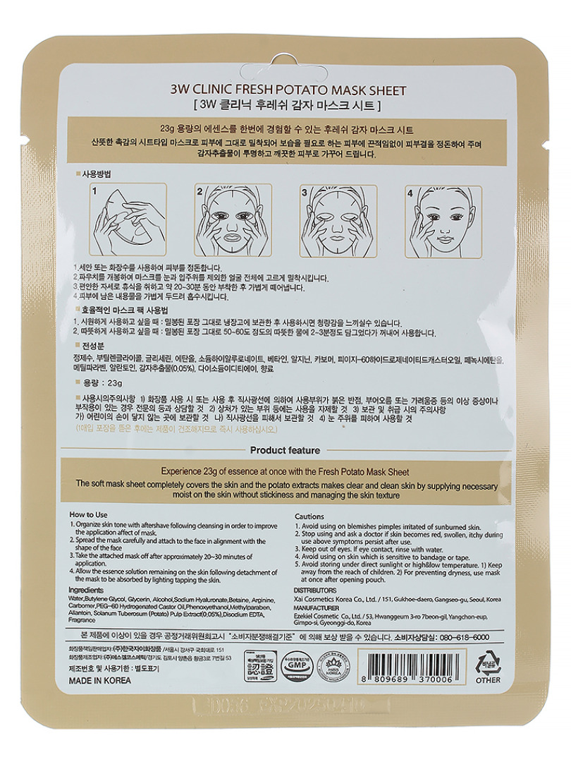 Изготовитель: Xai Cosmetics Co.,Ltd., Gangso-Gu, Geukhee Dae-ro 151, Seoul, Республика Корея. Тканевая маска с экстрактом картофеля увлажняет кожу, насыщает ее полезными микроэлементами и витаминами. Заживляет небольшие ранки и повреждения кожи, возвращает ей сияние и упругость. Снимает отечность.Способ применения: Нанести на чистую кожу лица и оставить на 15-20 минут, затем маску снять, а остатки средства распределить легкими похлопывающими движениями до полного впитывания.