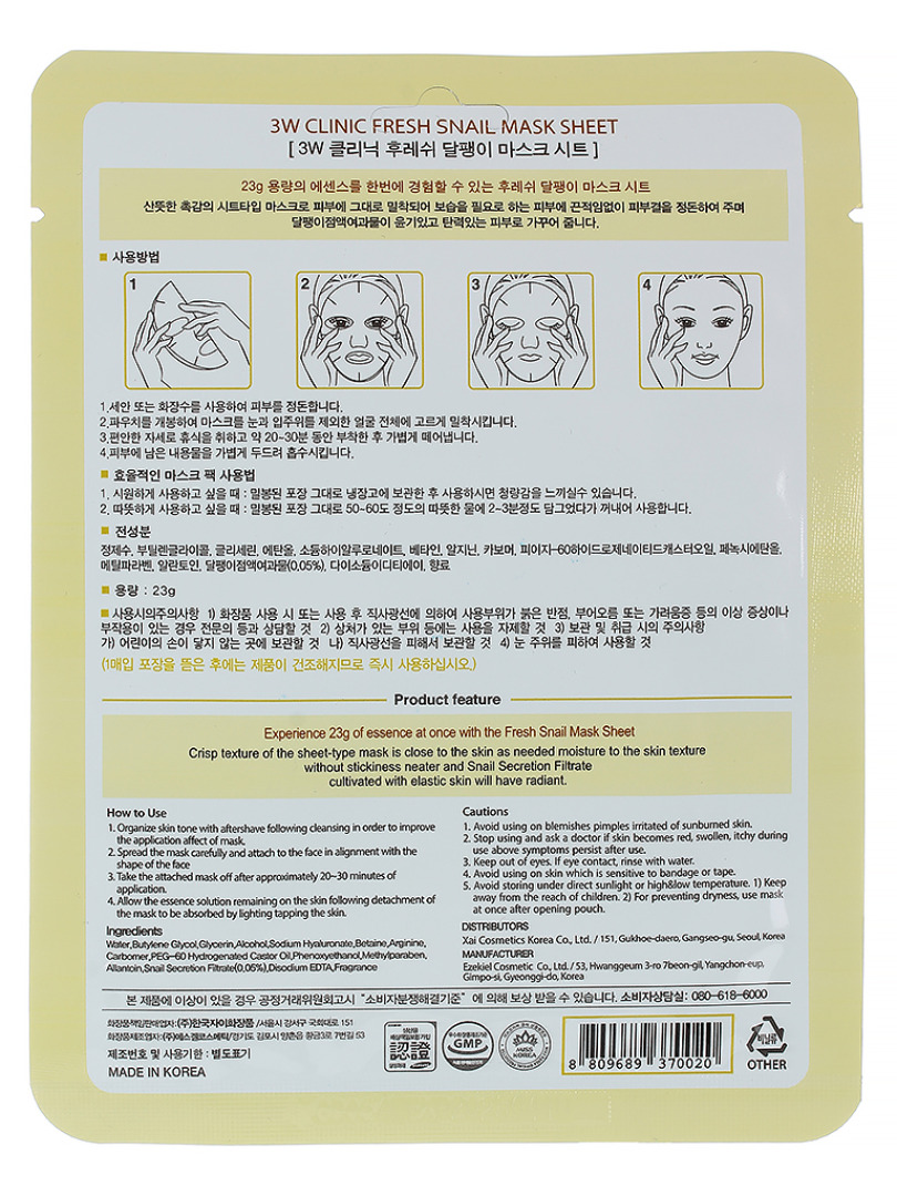 Изготовитель: Xai Cosmetics Co.,Ltd., Gangso-Gu, Geukhee Dae-ro 151, Seoul, Республика Корея. Тканевая маска с муцином улитки ускоряет процессы регенерации, улучшает цвет лица, помогает в борьбе с воспалениями и ранним старением кожи, укрепляет защитные функции и способствует осветлению пигментации и пост-акне. Подходит для всех типов кожи. Способ применения: Нанести на чистую кожу лица и оставить на 15-20 минут, затем маску снять, а остатки средства распределить легкими похлопывающими движениями до полного впитывания.