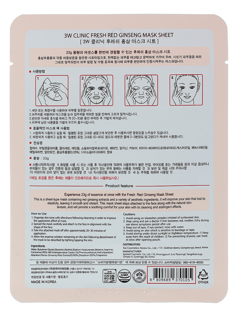 Изготовитель: Xai Cosmetics Co.,Ltd., Gangso-Gu, Geukhee Dae-ro 151, Seoul, Республика Корея. Тканевая маска с экстрактом корня красного женьшеня является сильным антиоксидантом, предотвращает процесс старения клеток, ускоряет регенерацию, улучшает метаболизм и состояние кожи в целом. Способ применения: Нанести на чистую кожу лица и оставить на 15-20 минут, затем маску снять, а остатки средства распределить легкими похлопывающими движениями до полного впитывания.