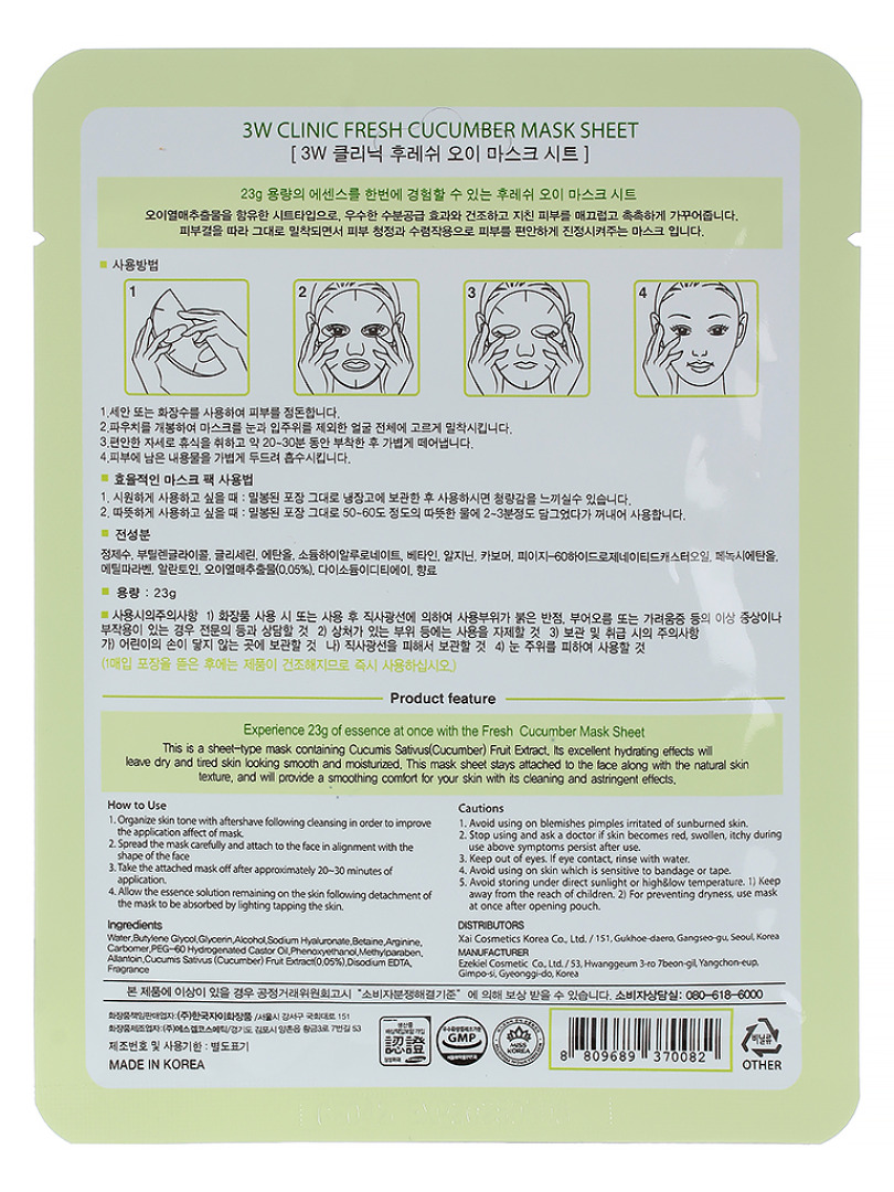 Изготовитель: Xai Cosmetics Co.,Ltd., Gangso-Gu, Geukhee Dae-ro 151, Seoul, Республика Корея. Тканевая маска с экстрактом огурца увлажняет и успокаивает, улучшает цвет лица, снимает зуд и воспаления, оказывает восстанавливающее и защитное действие, улучшает цвет лица и регулирует жирность кожи. Способ применения: Нанести на чистую кожу лица и оставить на 15-20 минут, затем маску снять, а остатки средства распределить легкими похлопывающими движениями до полного впитывания.