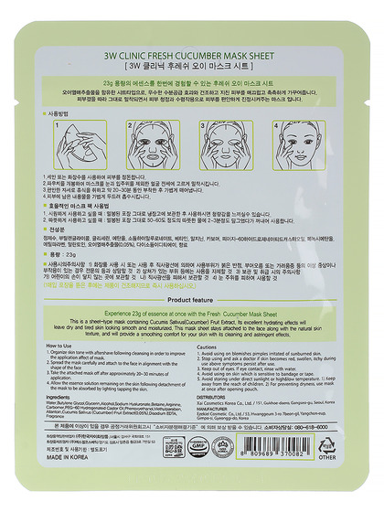 3W Маска тканевая с экстрактом огурца FRESH CUCUMBER MASK SHEET, 23ml