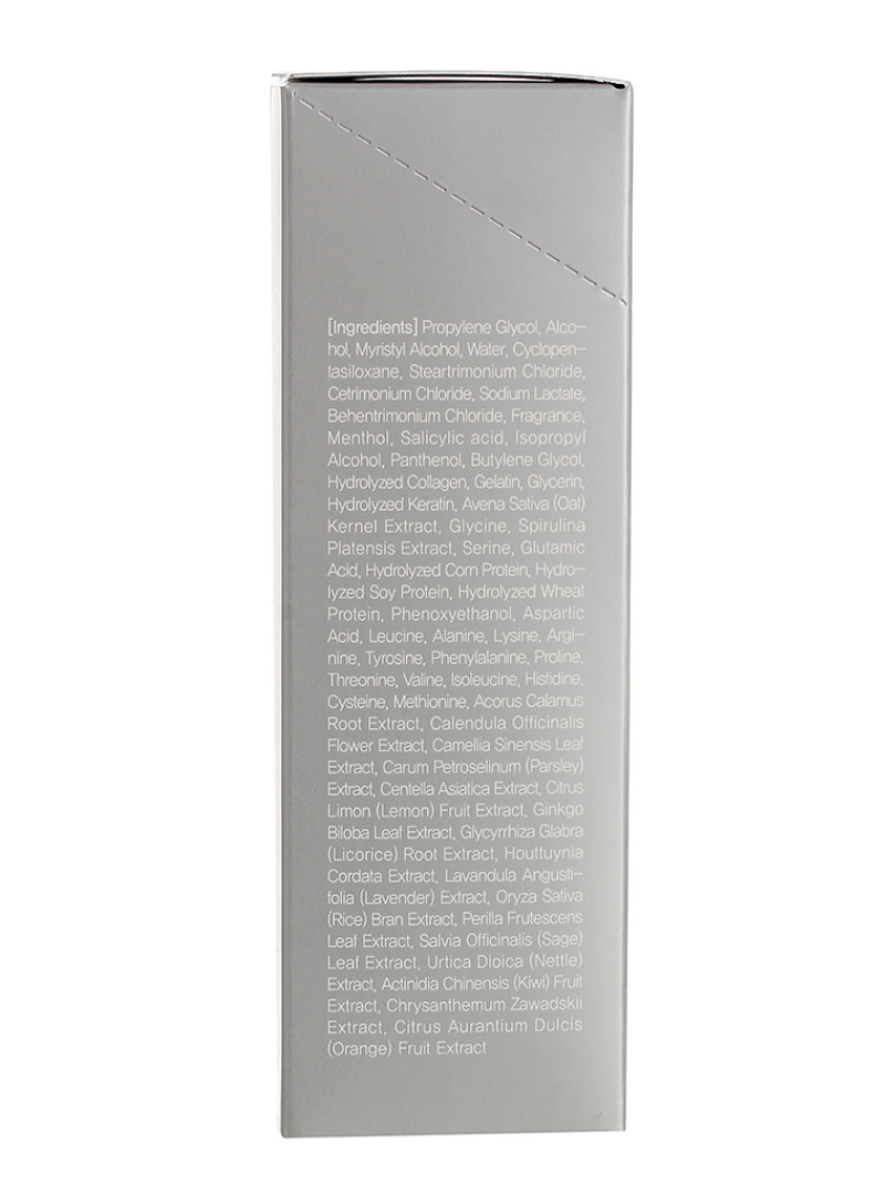 Propylene glycol, Water, Cetrimonium chloride, Steartrimonium chloride, Cyclopentasiloxane, Behentrimonium chloride, Sodium lactate, Menthol, Fragrance, Salicylic acid, Panthenol, Hydrolyzed collagen, Hydrolyzed keratin, Gelatin, Oat kernel extract, Hydrolyzed corn protein, Hydrolyzed wheat protein, Hydrolyzed soy protein, Licorice root extract, Camellia sinensis flower extract, Calendula officinalis flower extract, Salvia officinalis leaf extract, Acorus calamus root extract, Rice bran extract, Lavender extract, Centella asiatica extract, Perilla frutescens leaf extract, Ginkgo biloba leaf extract, Parsley extract, Lemon fruit extract, Orange fruit extract, Kiwi fruit extract, Chrysanthemum zawadskii extract, Spirulina platensis extract