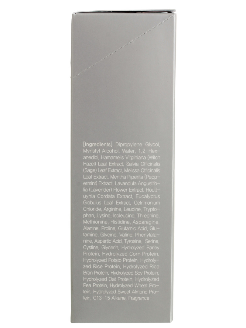 Dipropylene Glycol, Myristyl Alcohol, Water, Fragrance, Cetrimonium Chloride, 1,2-Hexanediol, C13-15 Alkane, Hamamelis Virginiana (Witch Hazel) Leaf Extract, Salvia Officinalis (Sage) Leaf Extract, Melissa Officinalis Leaf Extract, Mentha Piperita (Peppermint) Extract, Lavandula Angustifolia (Lavender) Flower Extract, Houttuynia Cordata Extract, Eucalyptus Globulus Leaf Extract, Glycerin, Hydrolyzed Barley Protein, Hydrolyzed Corn Protein, Hydrolyzed Potato Protein, Hydrolyzed Rice Protein, Hydrolyzed Rice Bran Protein, Hydrolyzed Soy Protein, Hydrolyzed Oat Protein, Hydrolyzed Pea Protein, Hydrolyzed Wheat Protein, Hydrolyzed Sweet Almond Protein, Arginine, Leucine, Tryptophan, Lysine