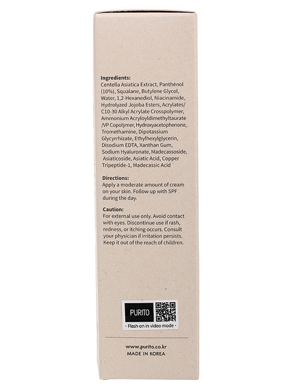 Centella Asiatica Extract, Panthenol (10%), Squalane, Butylene Glycol, Water, 1,2-Hexanediol, Niacinamide, Hydrolyzed Jojoba Esters, Acrylates/ 00-30 Alkyl Acrylate Crosspolymer, Ammonium Acryloyldimethyltaurate /VP Copolymer, Hydroxyacetophenone, Tromethamine, Dipotassium Glycyrrhizate, Ethylhexylglycerin, Disodium EDTA, Xanthan Gum, Sodium Hyaluronate, Madecassoside, Asiaticoside, Asiatic Acid, Copper Tripeptide-1, Madecassic Acid