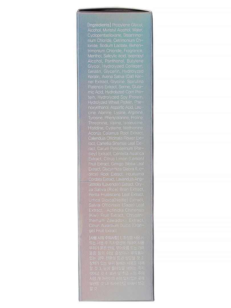 Propylene glycol, Water, Cetrimonium chloride, Steartrimonium chloride, Cyclopentasiloxane, Behentrimonium chloride, Sodium lactate, Menthol, Fragrance, Salicylic acid, Panthenol, Hydrolyzed collagen, Hydrolyzed keratin, Gelatin, Oat kernel extract, Hydrolyzed corn protein, Hydrolyzed wheat protein, Hydrolyzed soy protein, Licorice root extract, Camellia sinensis flower extract, Calendula officinalis flower extract, Salvia officinalis leaf extract, Acorus calamus root extract, Rice bran extract, Lavender extract, Centella asiatica extract, Perilla frutescens leaf extract, Ginkgo biloba leaf extract, Parsley extract, Lemon fruit extract, Orange fruit extract, Kiwi fruit extract, Chrysanthemum zawadskii extract, Spirulina platensis extract