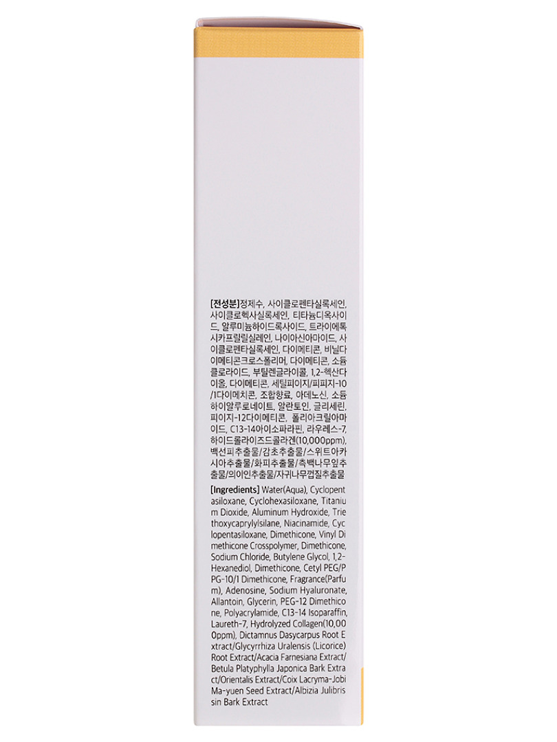 Water, Cyclopentasiloxane, Cyclohexasiloxane, Titanium Dioxide , Aluminum Hydroxide, Triethoxycaprylylsilane, Niacinamide, Cyclopentasiloxane, Dimethicone/Vinyl Dimethicone Crosspolymer, Dimethicone, Sodium Chloride, Butylene Glycol, 1,2-Hexanediol, Dimethicone, Hydrolyzed Collagen, Cetyl PEG/PPG-10/1 Dimethicone, Fragrance, Adenosine, Sodium Hyaluronate, Allantoin, Glycerin, PEG-12 Dimethicone, Polyacrylamide, C13-14 Isoparaffin, Laureth-, Dictamnus Dasycarpus Root Extract, Glycyrrhiza Uralensis (Licorice) Root Extract, Acacia Farnesiana Extract, Betula Platyphylla Japonica Bark Extract, Thuja Orientalis Extract, Coix Lacryma-Jobi Ma-yuen Seed Extract, Albizia Julibrissin Bark Extract
