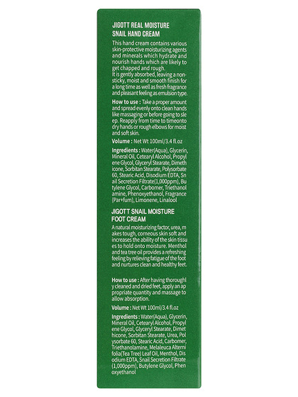 HAND: Water, Glycerin, Mineral Oil, Cetearyl Alcohol, Propylene Glycol, Glyceryl Stearate, Dimethicone, Sorbitan Stearate, Polysorbate 60, Stearic Acid, Disodium EDTA, Snail Secretion Filtrate, Butylene Glycol, Carbomer, Triethanolamine, Phenoxyethanol, Fragrance, Limonene, Linalool. FOOT: Water, Glycerin, Mineral Oil, Cetearyl Alcohol, Propylene Glycol, Glyceryl Stearate, Dimethicone, Sorbitan Stearate, Urea, Polysorbate 60, Stearic Acid, Carbomer, Triethanolamine, Melaleuca Alternifolia (Tea Tree) Leaf Oil, Menthol, Disodium EDTA, Snail Secretion Filtrate, Butylene Glycol, Phenoxyethanol