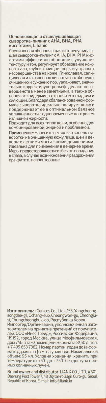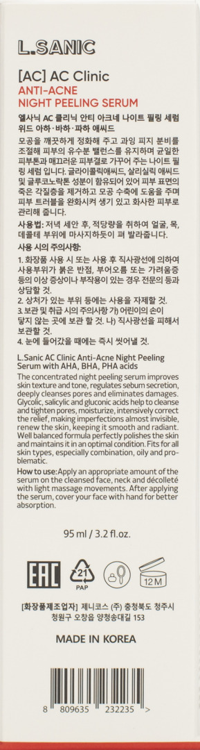 LSN AC Сыворотка-пилинг обновляющая и отшелушивающая с AHA, BHA, PHA кислотами AC Clinic Anti-Acne Night Peeling Serum with AHA, BHA, PHA acids, 95ml