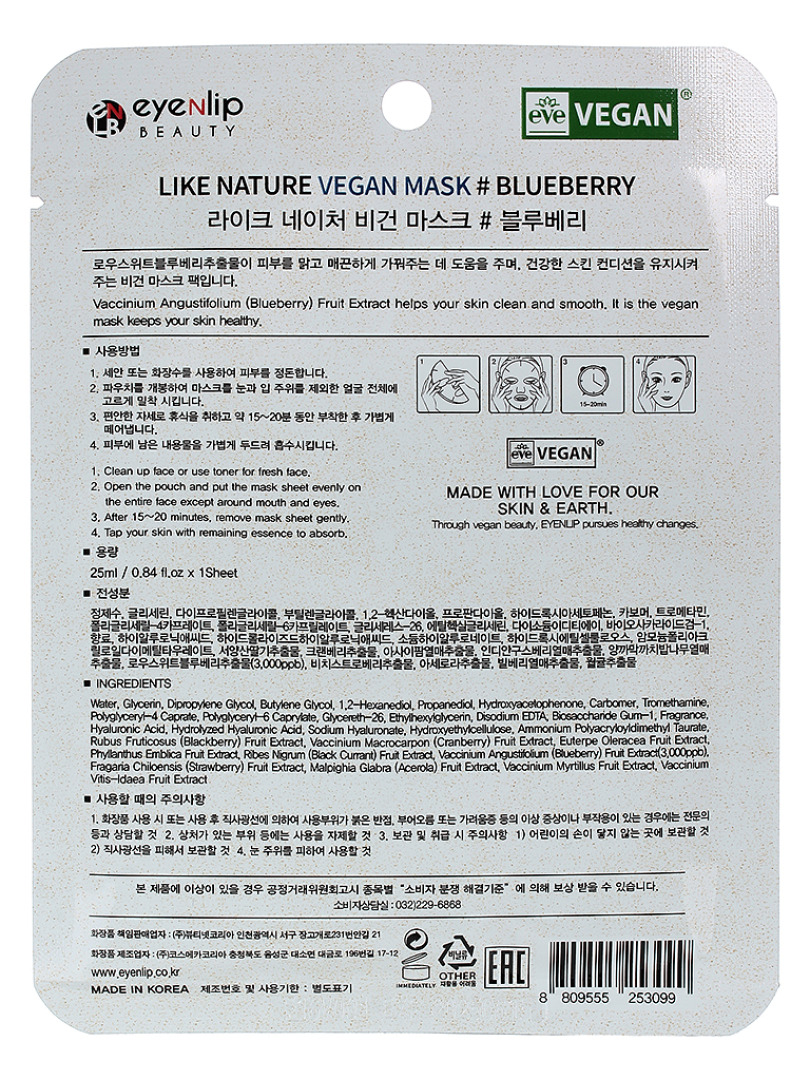 Изготовитель: Beautynet Korea Co. Ltd., КОРЕЯ, РЕСПУБЛИКА, 21, Janggogae-ro 231beonan-gil, Seo-gu, Incheon. Веган маска не содержит вредных ингредиентов, включает в состав экстракт черники. Очищает кожу и разглаживает морщины. Способ применения: на очищенную и тонизированную кожу лица нанесите маску на 15-20 минут, остатки эссенции распределите по коже лица.