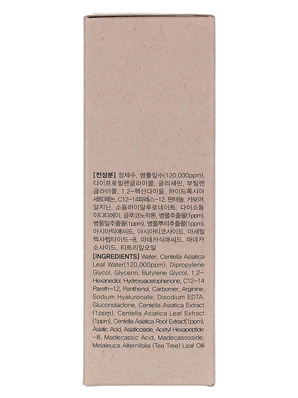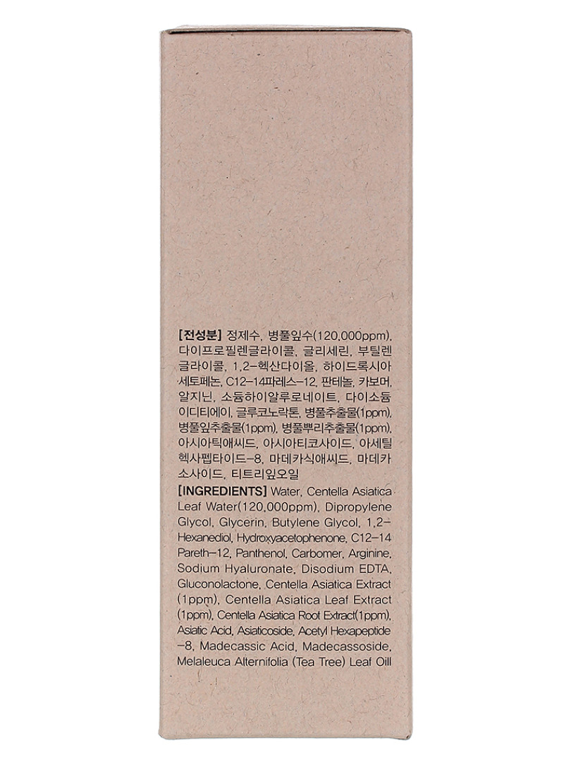 Water, Centella Asiatica Leaf Water, Dipropylene Glycol, Glycerin, Butylene Glycol, 1,2-Hexanediol, C12-14 Alketh-12, Hydroxyacetophenone, Panthenol, Arginine, Carbomer, Disodium EDTA, Sodium Hyaluronate, Melaleuca Alternifolia (Tea Tree) Leaf Oil, Gluconolactone, Centella Asiatica Root Extract, Centella Asiatica Leaf Extract, Centella Asiatica Extract, Madecassoside, Madecassic Acid, Acetyl Hexapeptide-8, Asiaticoside, Asiatic Acid