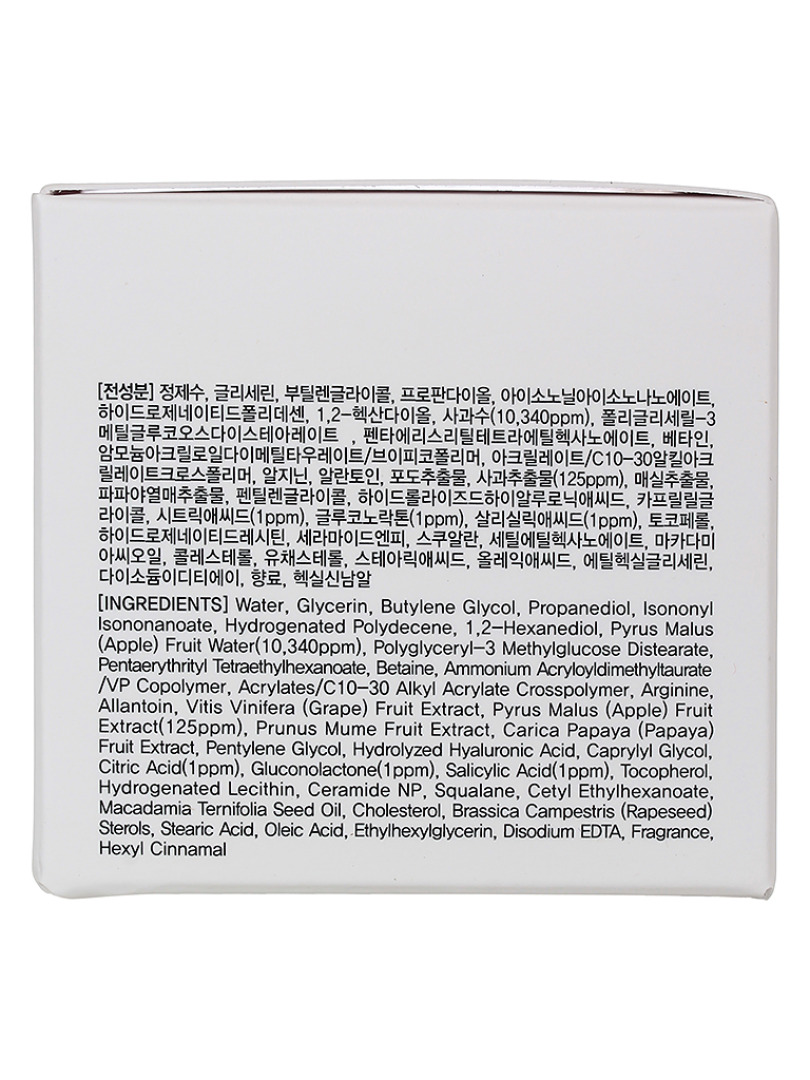 Water, Glycerin , Butylene Glycol, Propanediol, Isononyl Isononanoate, Hydrogenated Polydecene, 1,2-Hexanediol, Pyrus Malus (Apple) Fruit Water, Butylene Glycol, Pentylene Glycol, Caprylyl Glycol, 1,2-Hexanediol, Polyglyceryl-3 Methylglucose Distearate, Pentaerythrityl Tetraethylhexanoate, Water, Butylene Glycol, Hydrolyzed Hyaluronic Acid, 1,2-Hexanediol, Caprylyl Glycol, Ethylhexylglycerin, Water, Butylene Glycol, Carica Papaya (Papaya) Fruit Extract, Pyrus Malus (Apple) Fruit Extract, Vitis Vinifera (Grape) Fruit Extract, Prunus Mume Fruit Extract, Betaine, Ammonium Acryloyldimethyltaurate/VP Copolymer, Arginine, Acrylates/C10-30 Alkyl Acrylate Crosspolymer, Ethylhexylglycerin, Tocopherol, Disodium EDTA, Allantoin, Fragrance, Salicylic Acid, Citric Acid, Water, Glycerin, Hydrogenated Lecithin, Ceramide NP, 1,2-Hexanediol, Cholesterol, Cetyl Ethylhexanoate, Squalane, Macadamia Ternifolia Seed Oil, Stearic Acid, Tocopherol, Oleic Acid, Brassica Campestris (Rapeseed) Sterols, Gluconolactone