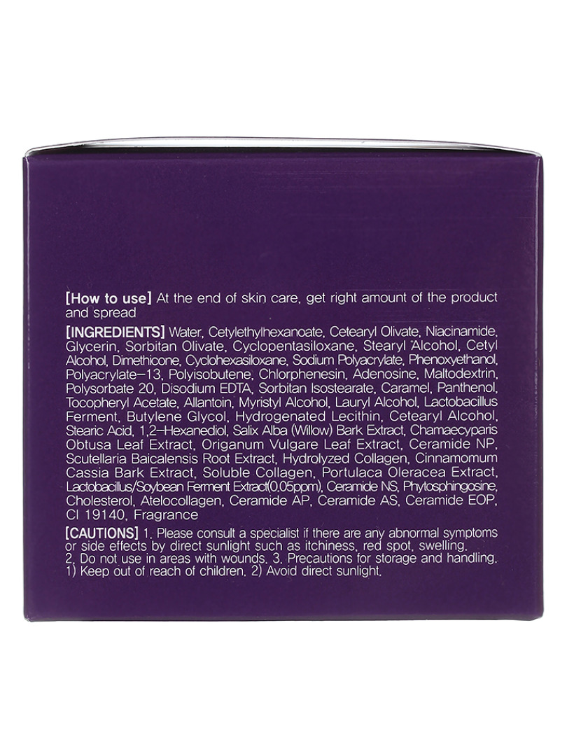 Water, Cetylethylhexanoate, Cetearyl Olivate, Niacinamide, Glycerin, Sorbitan Olivate, Cyclopentasiloxane, Stearyl Alcohol, Cetyl Alcohol, Dimethicone, Cyclohexasiloxane, Sodium Polyacrylate, Phenoxyethanol, Polyacrylate-13, Polyisobutene, Chlorphenesin, Adenosine, Maltodextrin, Polysorbate 20, Disodium EDTA, Sorbitan Isostearate, Caramel, Panthenol, Tocopheryl Acetate, Allantoin, Myristyl Alcohol, Lauryl Alcohol, Lactobacillus Ferment, Butylene Glycol, Hydrogenated Lecithin, Cetearyl Alcohol, Stearic Acid, 1,2-Hexanediol, Salix Alba (Willow) Bark Extract, Chamaecyparis Obtusa Leaf Extract, Origanum Vulgare Leaf Extract, Ceramide NP, Scutellaria Baicalensis Root Extract, Hydrolyzed Collagen, Cinnamomum Cassia Bark Extract, Soluble Collagen, Portulaca Oleracea Extract, Lactobacillus/Soybean Ferment Extract(0.05ppm), Ceramide NS, Phytosphingosine, Cholesterol, Atelocollagen, Ceramide AP, Ceramide AS, Ceramide EOP, CI 19140, Fragrance